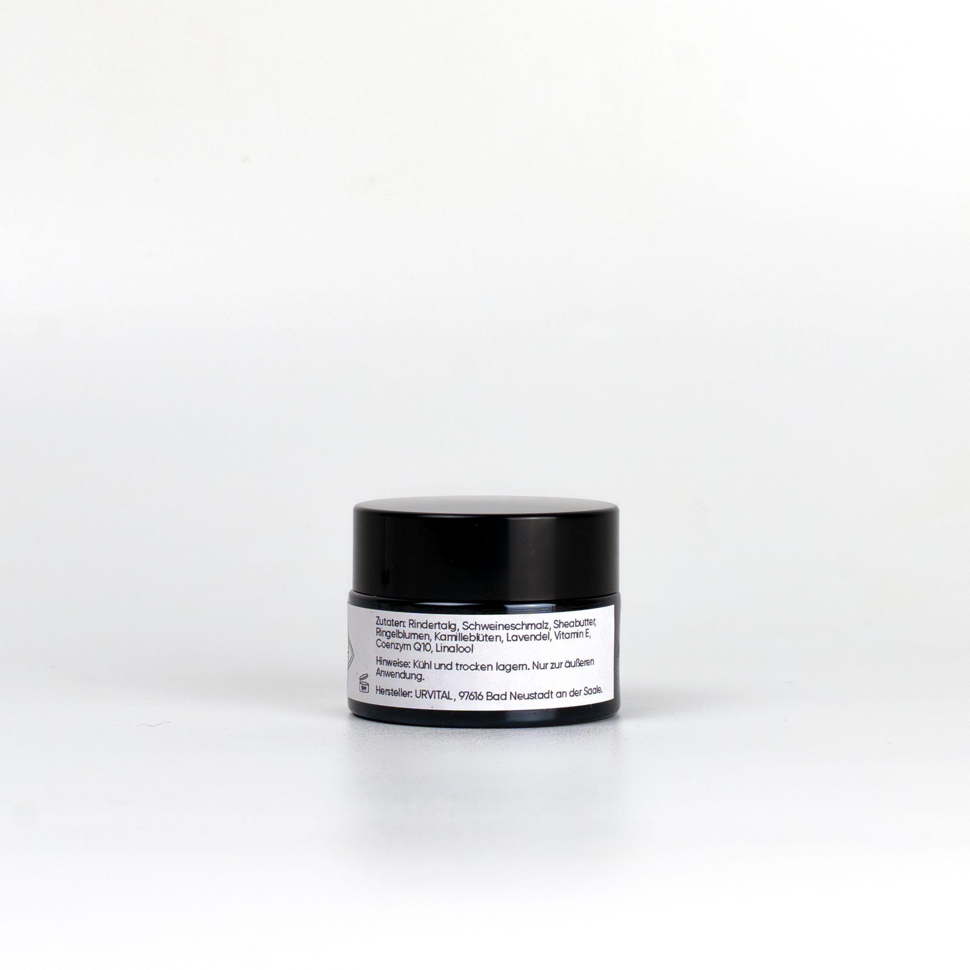 Unser Balsam vereint die Kraft traditioneller Heilpflanzen mit wertvollen Naturstoffen und sorgfältiger Handarbeit. Die Kombination aus Ringelblume, Kamille und Lavendel pflegt trockene, empfindliche und beanspruchte Haut intensiv und unterstützt die natürlichen Regenerationsprozesse der Hautzellen. Die zartschmelzende Textur lässt sich angenehm auftragen und sorgt für ein geschmeidiges Hautgefühl – ganz ohne Duftstoffe oder Zusätze. Hochwertiger Bio-Rindertalg und Bio-Schweineschmalz zeichnen sich durch eine Fettzusammensetzung aus, die der des menschlichen Sebums stark ähnelt. Dadurch werden sie besonders gut von der Haut aufgenommen und hinterlassen keinen fettigen Film. Ideal für die tägliche Pflege von Gesicht, Händen, Füßen und besonders beanspruchten Körperpartien.