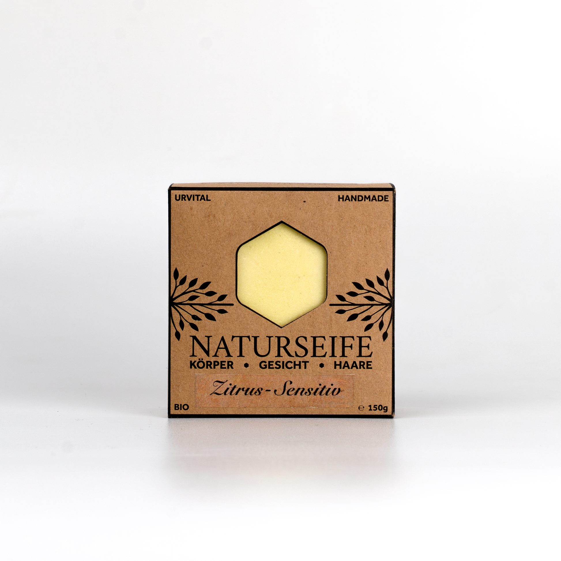 Erlebe pure Entspannung mit unserer Zitrus-Sensitiv Naturseife – handgefertigt aus besten Zutaten für Körper, Haare und Gesicht. Die reichhaltige Rezeptur sorgt für einen cremigen, sanften Schaum und reinigt gründlich, ohne die Haut auszutrocknen. Wertvolle Pflanzenöle mit 15% Rückfettung spenden intensive Feuchtigkeit und hinterlassen ein geschmeidiges, gepflegtes Hautgefühl. Perfekt für alle, die natürliche, vegane und nachhaltige Pflege schätzen.